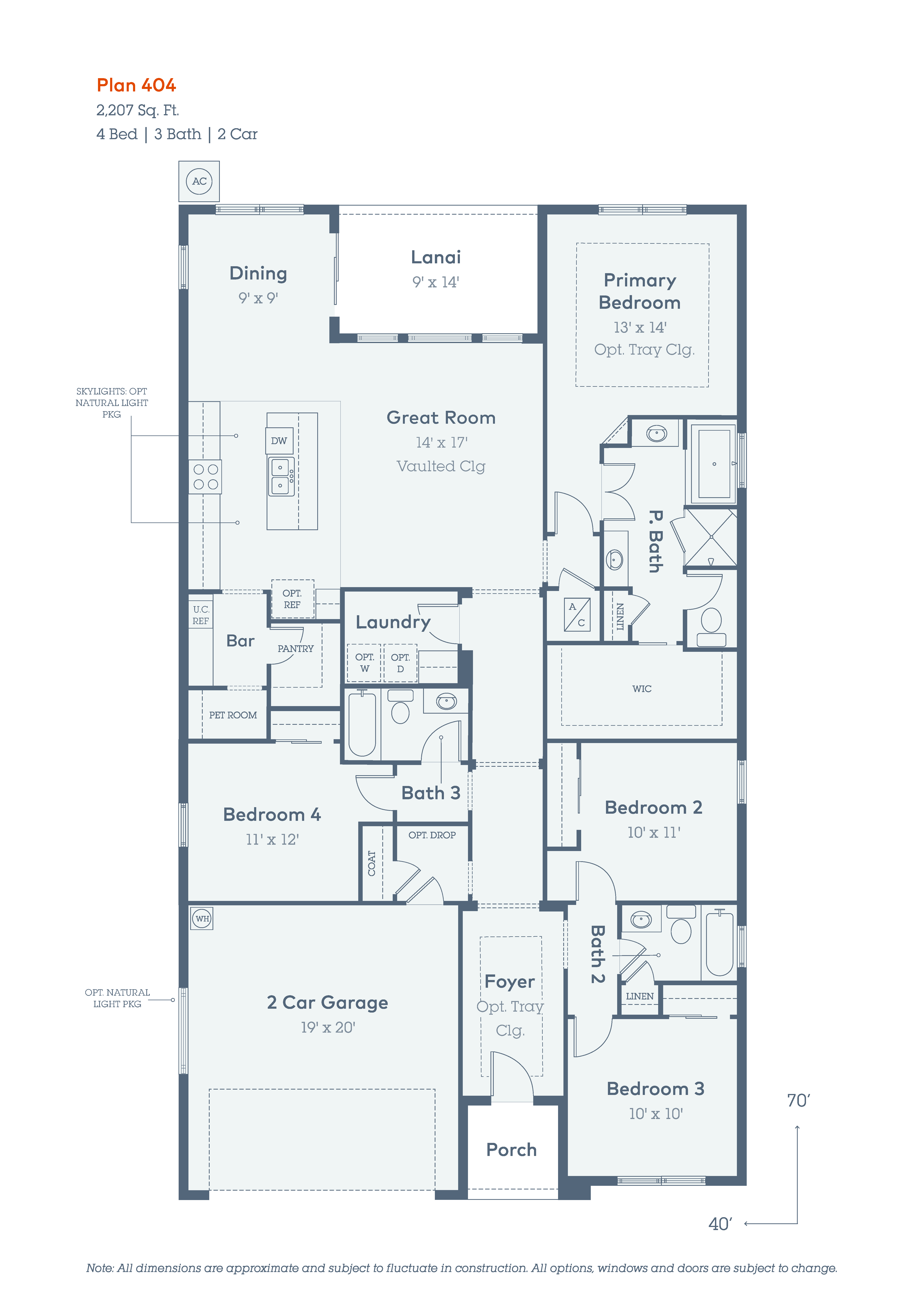 Plan 404 is a beautiful open concept one-story home. This floor plan has it all, 4 bedrooms, 3 bathrooms, 9'4'' ceilings throughout, covered lanai, and 2 car-garage offering 2,207 sq. ft. of living space.